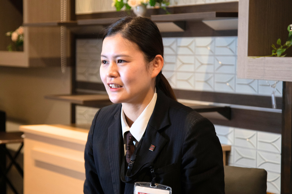 私自身も身だしなみや立ち居振る舞いなど日々勉強、意識しながらお客様とかかわっています。たくさんのお客様とかかわる中で、高齢者の方とかかわる時は特に、目線を合わせる、ゆっくり大きな声で話すなど意識しています。これまでの介護の経験やスキルはとても大切で、それらを発揮しながら仕事ができる環境であると日々実感しております。