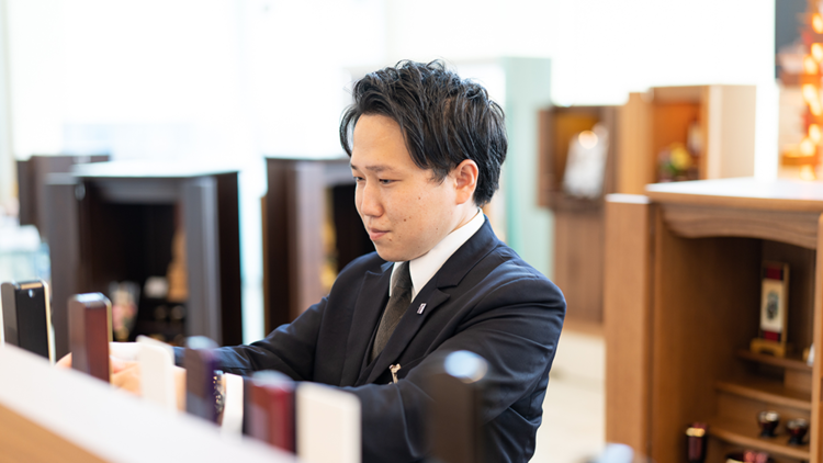 全体の手配と同時進行で、私自身も担当者として実際の葬儀の進行にも携わります。葬儀が終わった後はアフターフォローもあり、法事や遺品整理、お仏壇や墓石の相談なども行っています。